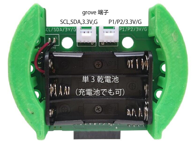 ⑥拡張ピン(P0,P1,P2,P15,I2C)があるので、サーボモーターや外部液晶ディスプレイなどをつなげるなど拡張に富みます。裏面に、grove端子2個(P1,P2,3.3V,G I2C)があります。